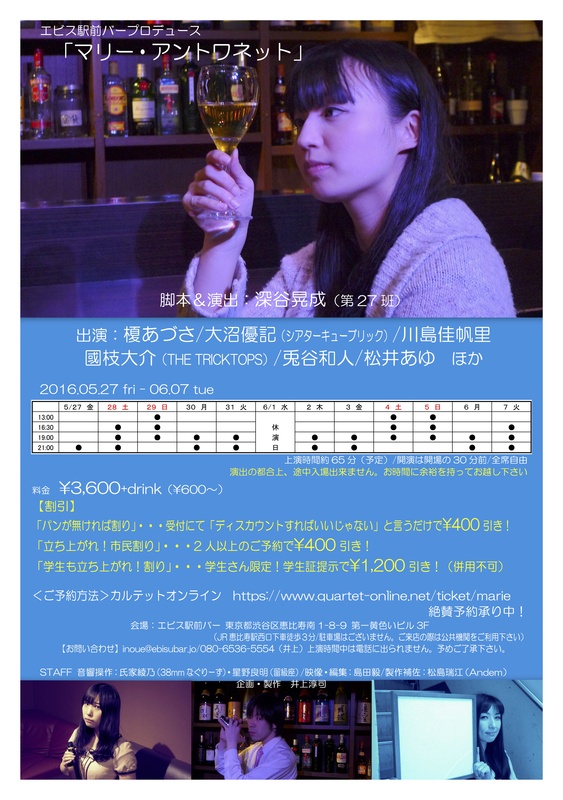 久々の26ステージ挑戦。 好きな作家さんの作品なので、まずは自分が楽しみ。 そして、楽しめる作品をお届けします!! エビス駅前バープロデュース 『マリー・アントワネット』 脚本・演出:深谷晃成(第27班) ~あらすじ~ とある中企業の創業一族の箱入り娘、安藤真里が営業部に入社してきた! 親の顔を良いことに好き勝手公私混同を繰り返す安藤真里に翻弄される営業部。 ストレスは臨界点を突破しようとしていた。 果たして営業部に平和は訪れるのか? 又、営業部員達の腹痛はストレスによるものなのか? 史実を基に現代版としてお送りするコメディー群像劇。 「A4がなければB5を使えばいいじゃない」 【Cast】 大沼優記(シアターキューブリック) 榎あづさ 川島佳帆里 國枝大介(THE TRICKTOPS) 松井あゆ 兎谷和人 他 【料金】 3,600円+ドリンク代(600円~) ※割引(併用不可) ◎パンが無ければ割り…受付にて「ディスカウントすればいいじゃない」と言うだけで400円引き。 ◎立ち上がれ!市民割り…2人以上のご予約で400円引き。 ●学生も立ち上がれ!割り…学生さん限定!学生証提示で1,200円引き! 【タイムテーブル】 5/27(金)21:00 28(土)16:30/19:00/21:00 29(日)13:00/16:30/19:00 30(月)19:00/21:00 31(火)19:00/21:00 6/1(水)休演日 2(木)19:00/21:00 3(金)19:00/21:00 4(土)13:00/16:30/19:00 5(日)13:00/16:30/19:00 6(月)19:00/21:00 7(火)16:30/19:00/21:00 【ご予約フォーム】 https://www.quartet-online.net/ticket/marie?m=0bcegfc コメディです! お楽しみに★ PR